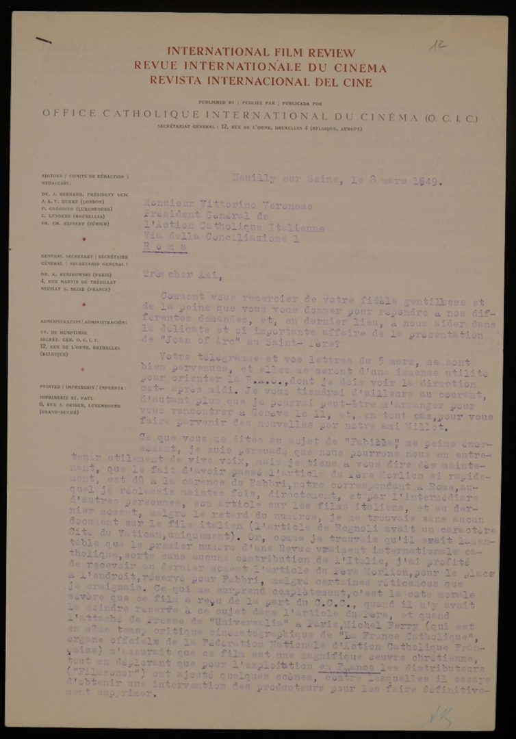 Lettera di André Ruszkowski, segretario generale per le relazioni estere dell'Office catholique international du cinematographe - OCIC, a Vittorino Veronese, presidente generale dell'ACI