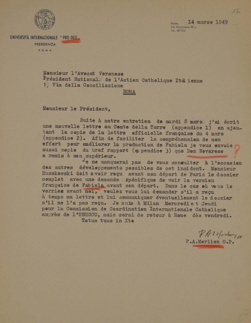 Padre Félix Morlion aggiorna Vittorino Veronese sugli sviluppi della vicenda del film "Fabiola" e della versione francese della pellicola. Dattiloscritto