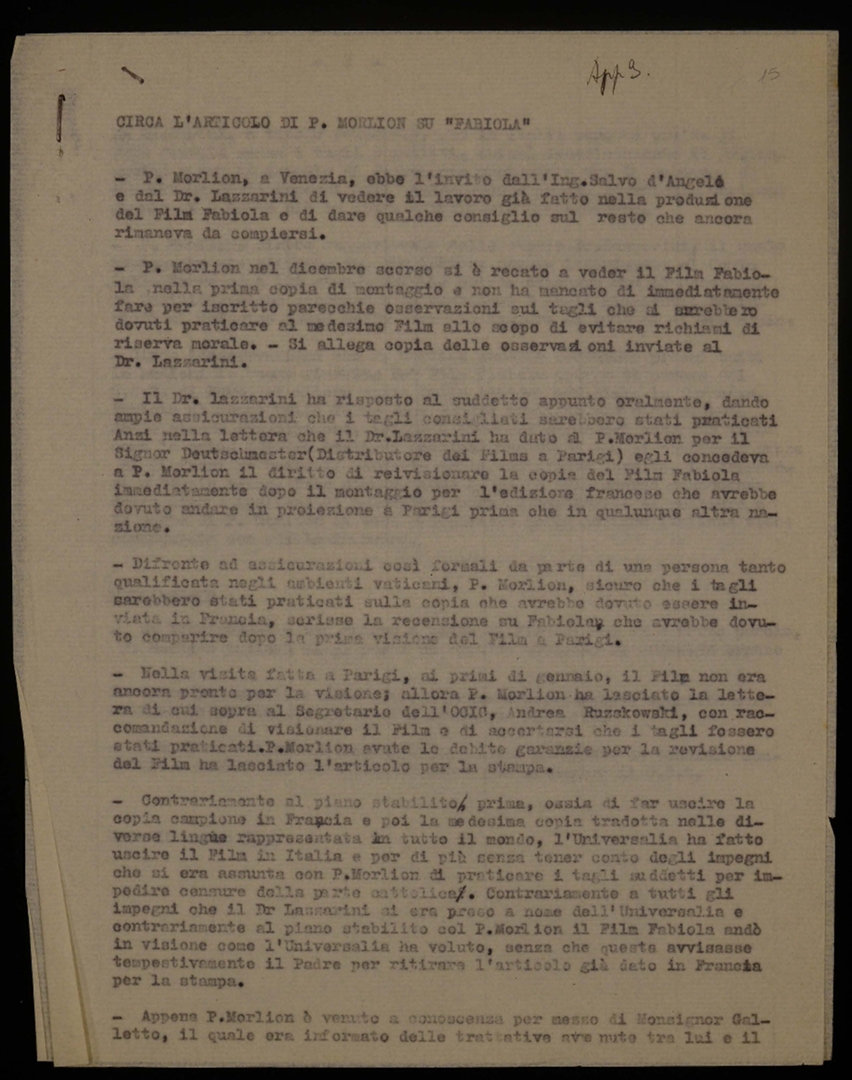 Resoconto sulla vicenda del film "Fabiola": richiesta di tagli alla pellicola, distribuzione,, recensioni, posizione dei diversi organismi cinematografici cattolici. Dattiloscritto
