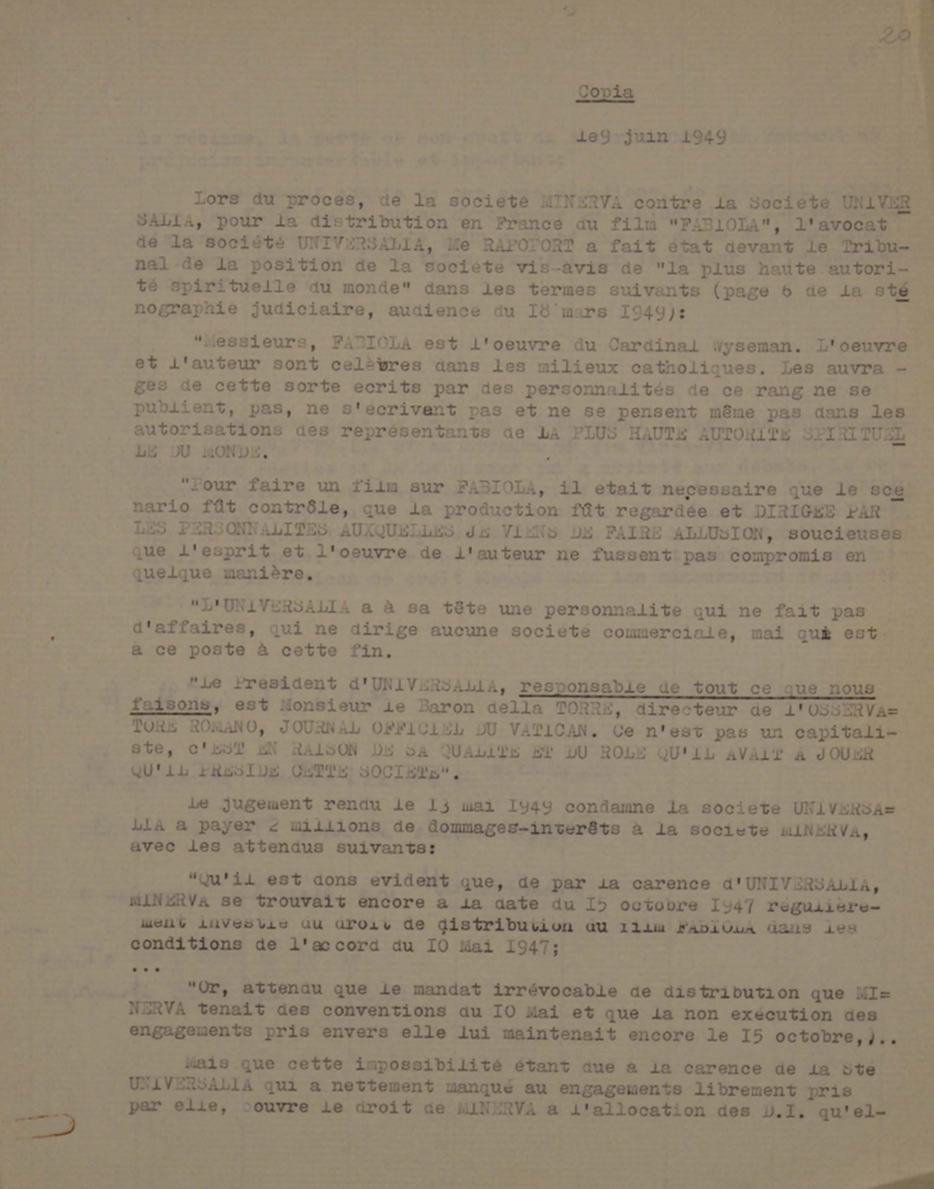 Nota sul contenzioso tra la società Minerva e la società Universalia a proposito della distribuzione francese del film "Fabiola"