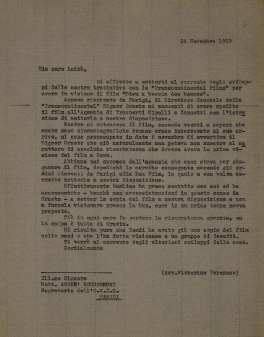 Vittorino Veronese comunica a André Ruszkowski gli sviluppi delle trattative per la visione in anteprima del film "Dieu a besoin des hommes" di Jean Delannoy. Dattiloscritto