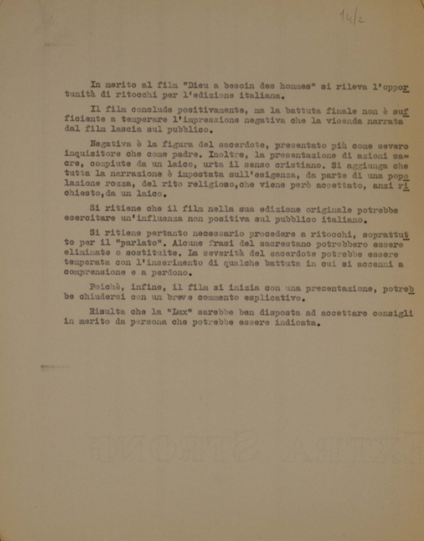 Segnalazione della necessità di ritocchi all'edizione italiana del film, Dattiloscritto