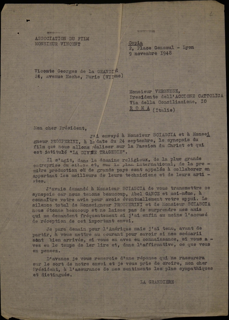 Lettera di Georges de la Grandiere, su carta intestata a Association du film Monsieur Vincent, a Vittorino Veronese, presidente generale dell'ACI