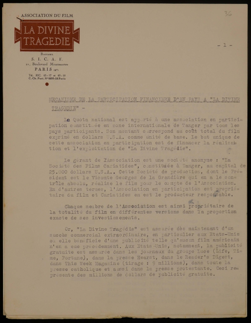 Nota sulla partecipazione finanziaria di diversi paesi all'opera "La Divine Tragedie". Dattiloscritto