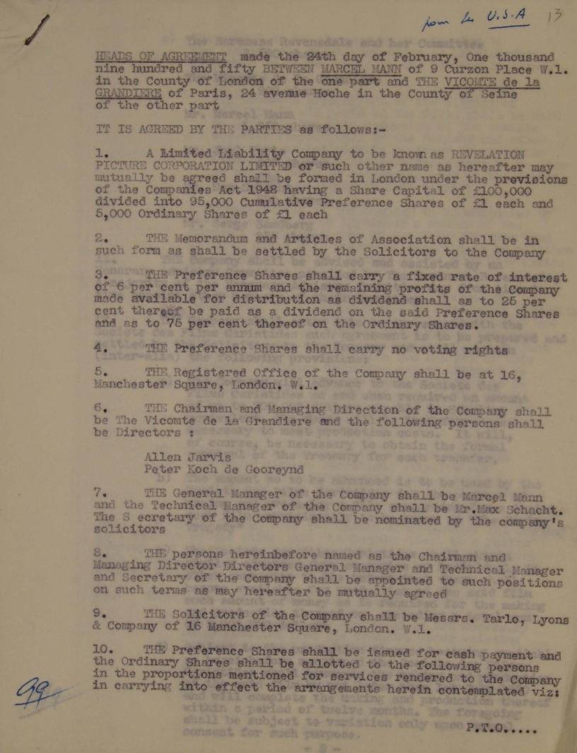 Termini dell'intesa tra le società interessate alla coproduzione. Dattiloscritto