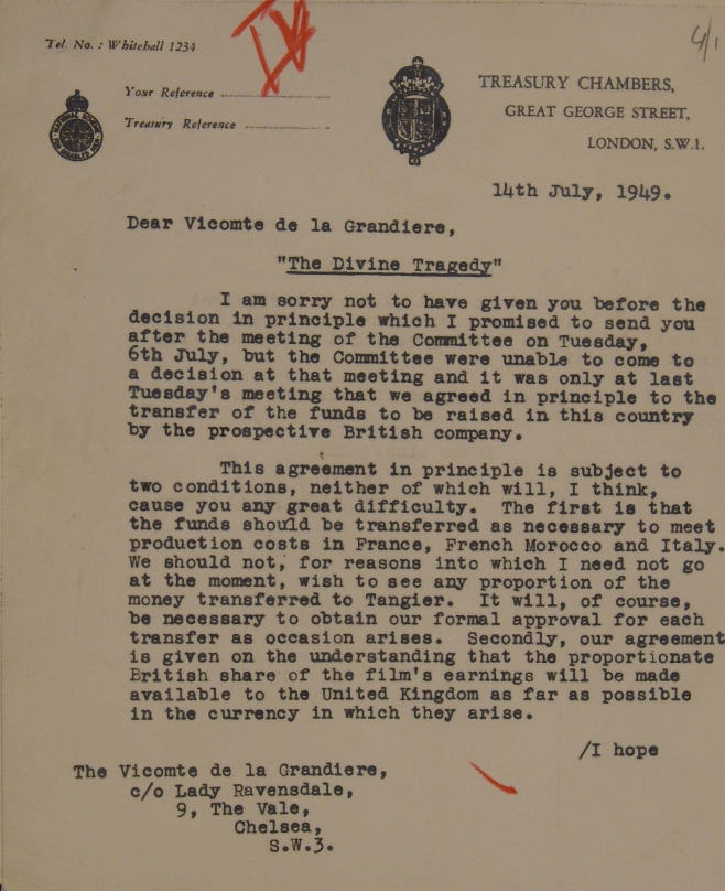 Milner Barry scrive al produttore George de la Grandiere a proposito degli sviluppi del progetto cinematografico "La Divine Tragedie". Dattiloscritto