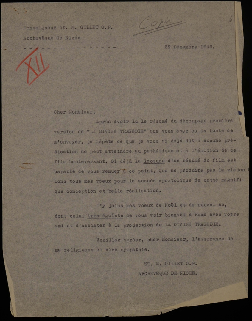 Stanislas Martin-Marie Gillet comunica il suo parere sul progetto cinematografico "La Divine Tragedie". Dattiloscritto