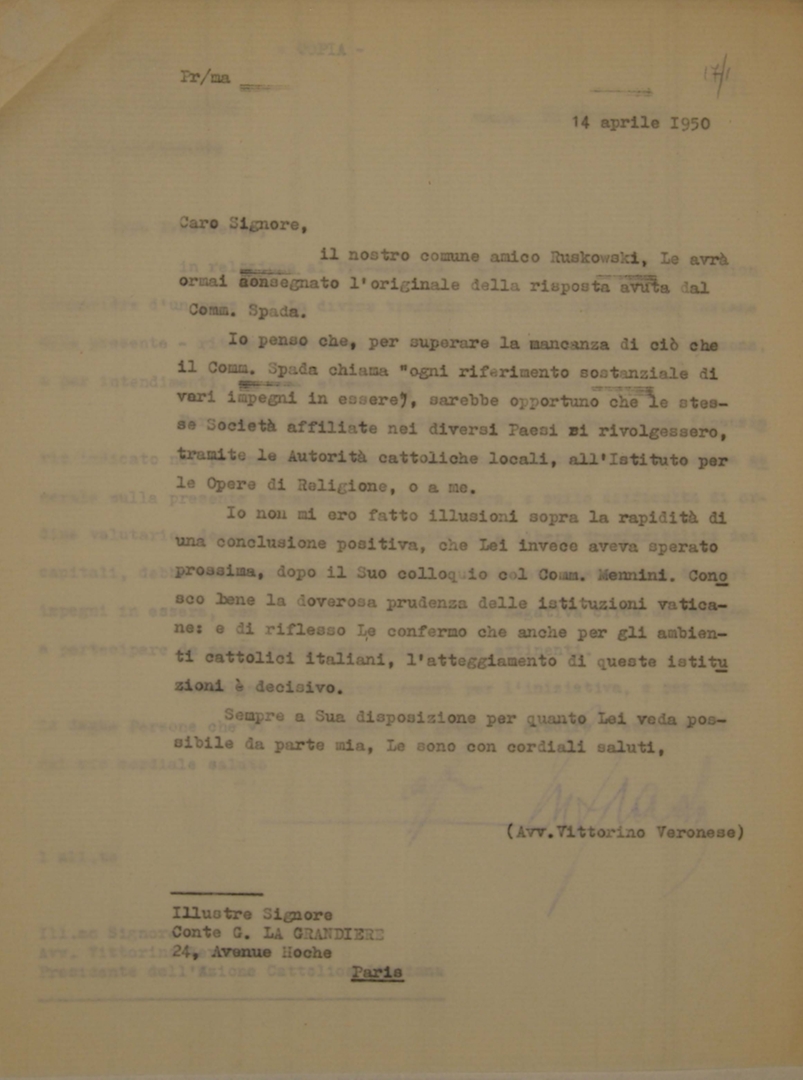 Vittorino Veronese scrive a George de la Grandiere a proposito dell'atteggiamento delle istituzioni vaticane sui finanziamenti al film "La Divine Tragedie". Dattiloscritto
