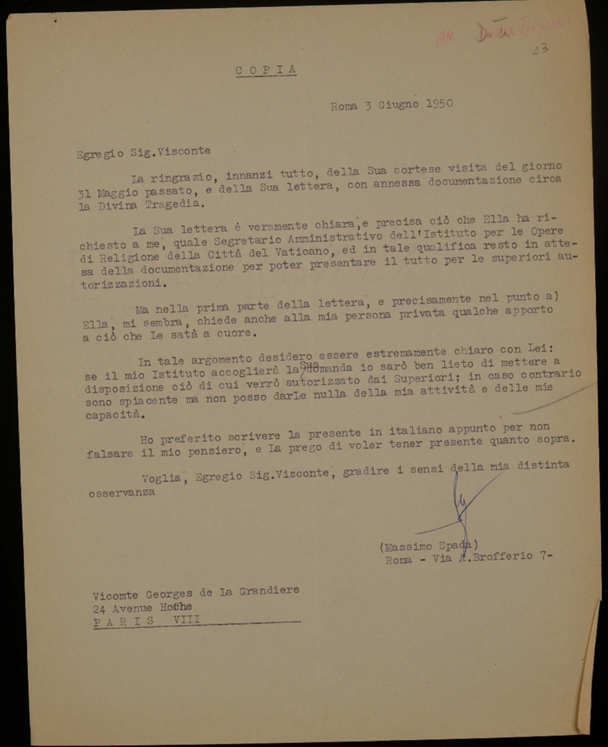 Lettera di Massimo Spada, segretario amministrativo dell'Istituto per le opere di religione della Città del Vaticano, a George de la Grandiere