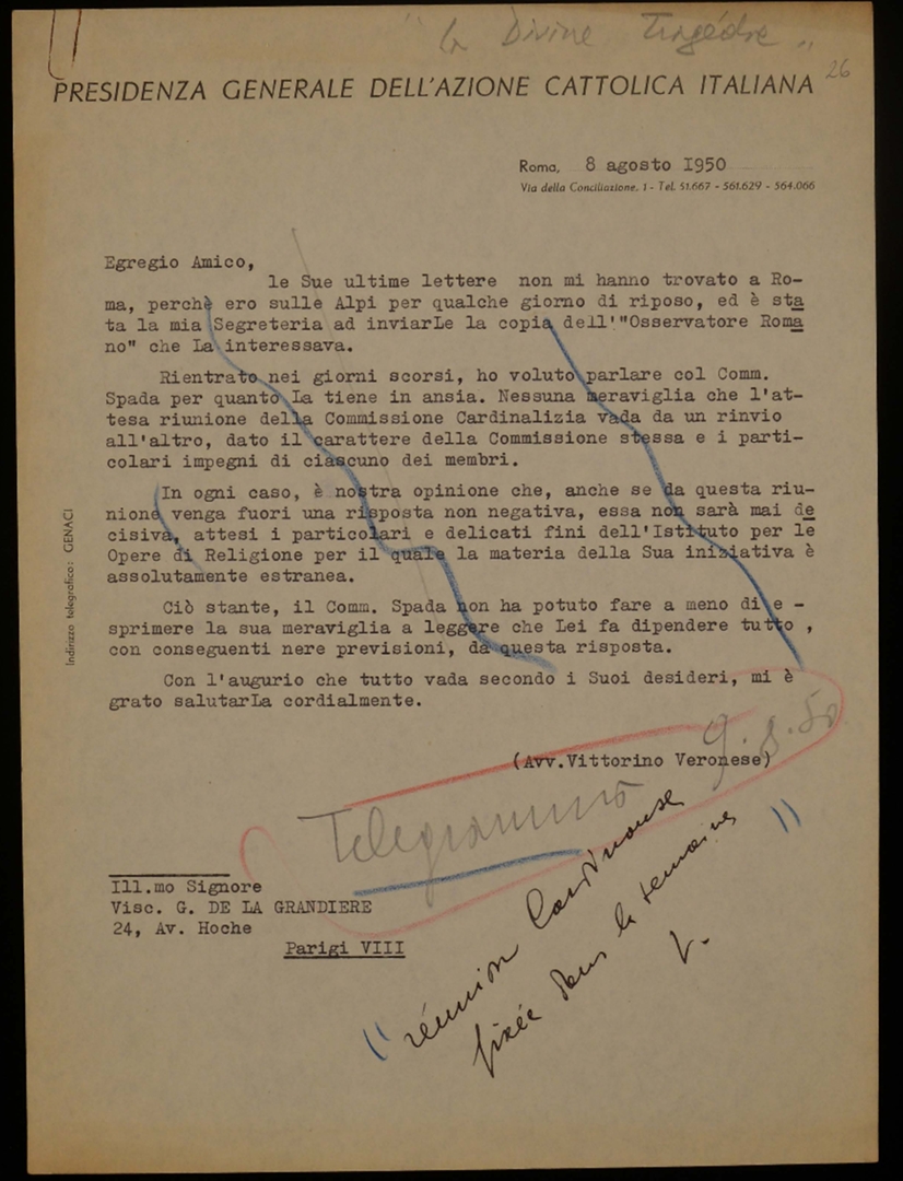 Lettera di Vittorino Veronese, presidente generale dell'ACI, a Georges de la Grandiere
