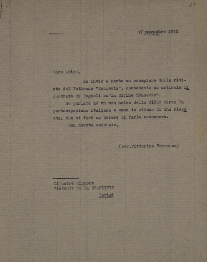 Vittorino Veronese invia a Georges de la Grandiere copia di un articolo riguardante il progetto cinematografico "La Divine Tragedie" apparso sul periodico del Vaticano "Ecclesia". Con cenni alla partecipazione italiana alla realizzazione del film. Dattiloscritto