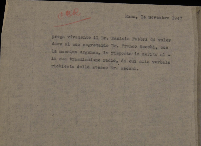Appunto per Daniele Fabbri, segretario del Centro cattolico radiofonico - CCR, su un quesito posto dal segretario Franco Recchi. Dattiloscritto