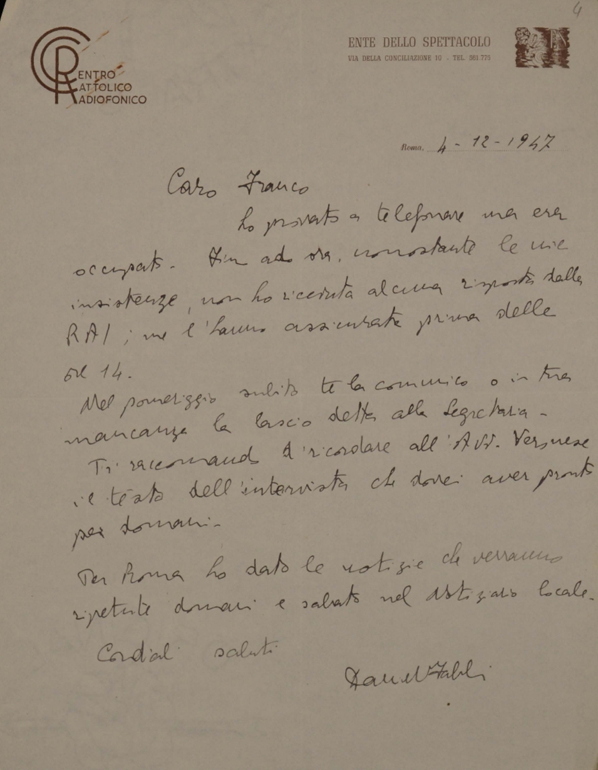 Daniele Fabbri informa Franco Recchi sulle trasmissioni radiofoniche in programma. Manoscritto