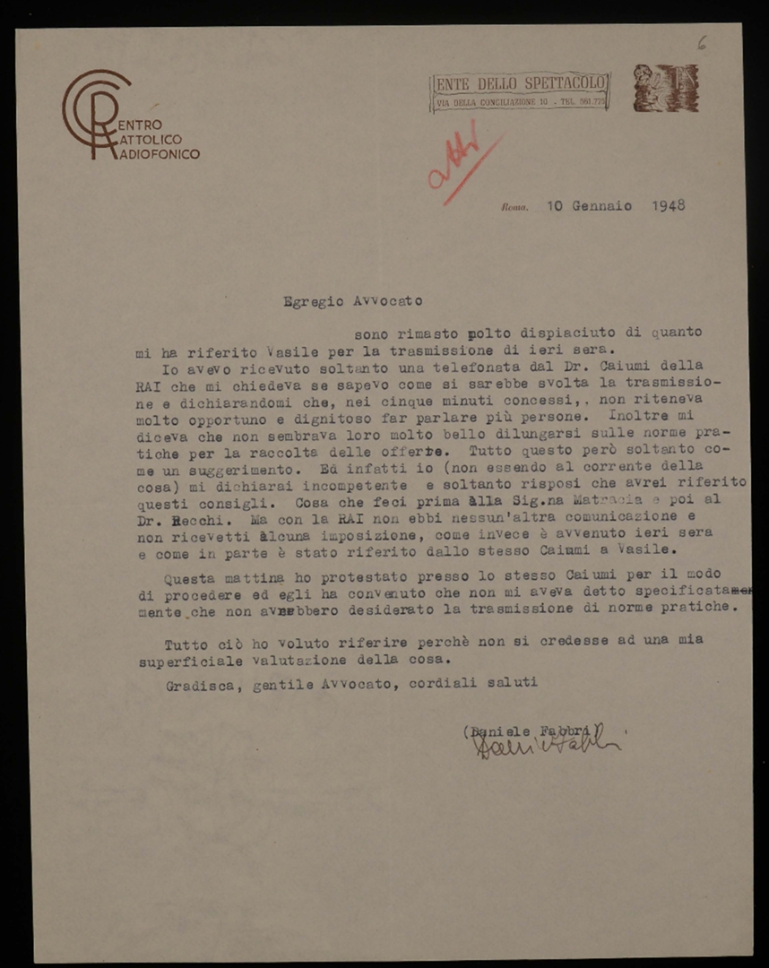 Lettera di Daniele Fabbri, segretario del Centro cattolico radiofonico - CCR, a Vittorino Veronese, presidente generale dell'ACI