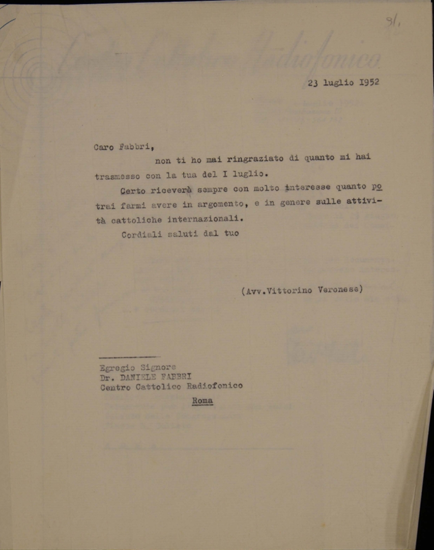 Lettera di Vittorino Veronese, presidente del Comitato permanente per i congressi internazionali dell'apostolato dei laici, a Daniele Fabbri, segretario del Centro cattolico radiofonico - CCR