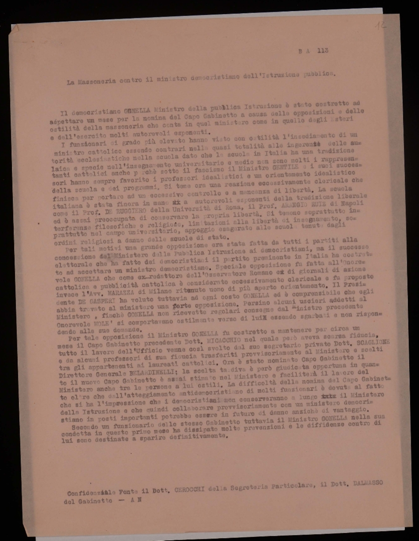 Nota va relativa all'atteggiamento della massoneria nei riguardi del ministro Guido Gonella. Dattiloscritto