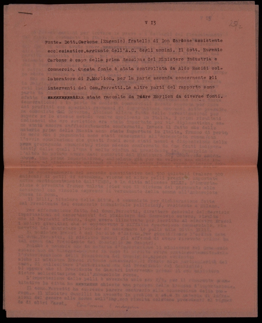 Indagine su operazioni commerciali a favore dei comunisti. Dattiloscritto