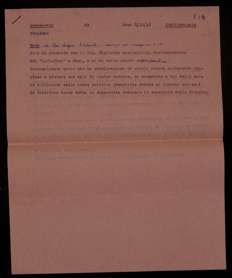 Informazioni riguardanti la Jugoslavia. Dattiloscritto