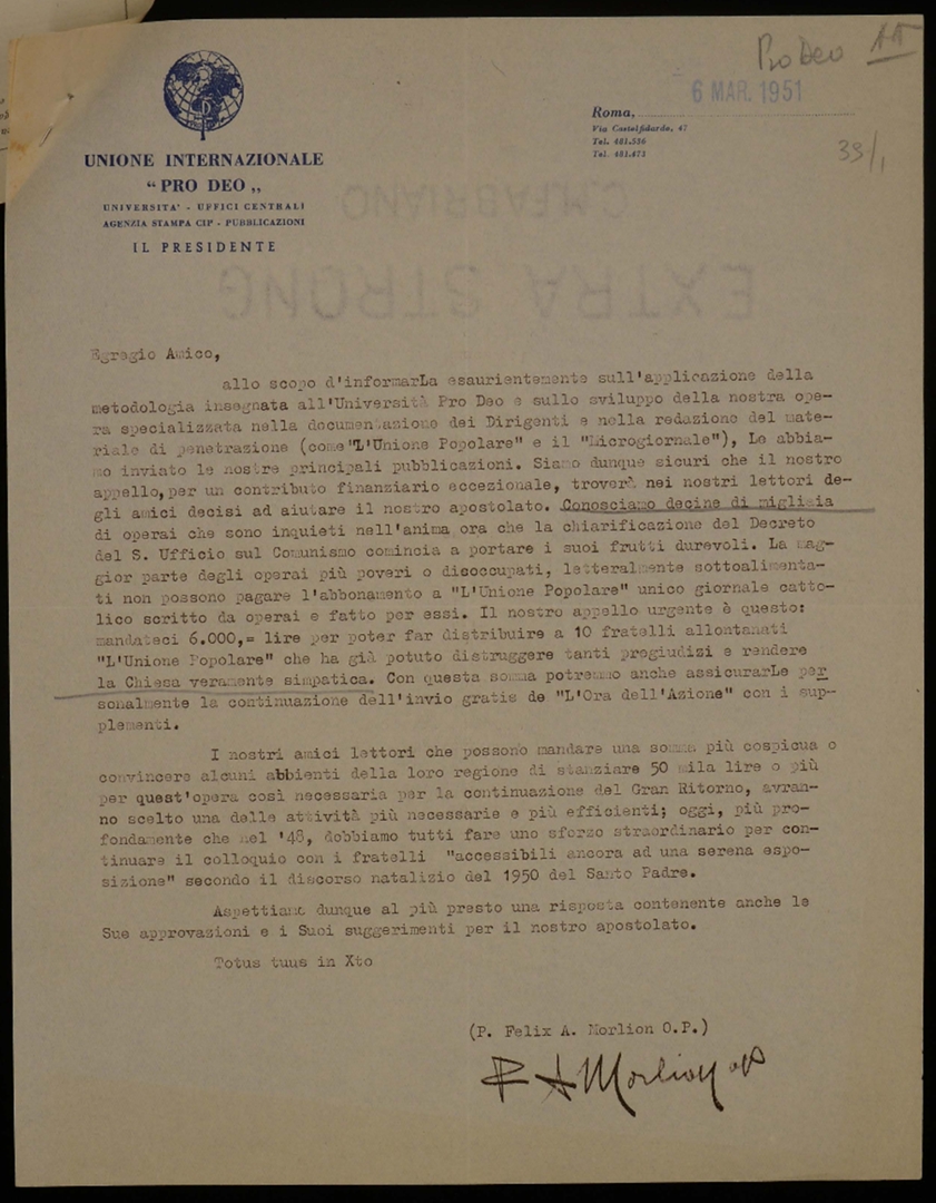 Lettera a firma di padre Félix Morlion, direttore dell'agenzia di stampa cattolica Centro di informazione Pro Deo - CIP, ai lettori delle pubblicazioni periodiche dell'Università