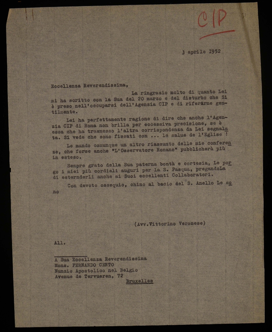 Vittorino Veronese scrive a mons. Fernando Cento a proposito dell'Agenzia del Centro informazioni Pro Deo - CIP di Roma. Dattiloscritto