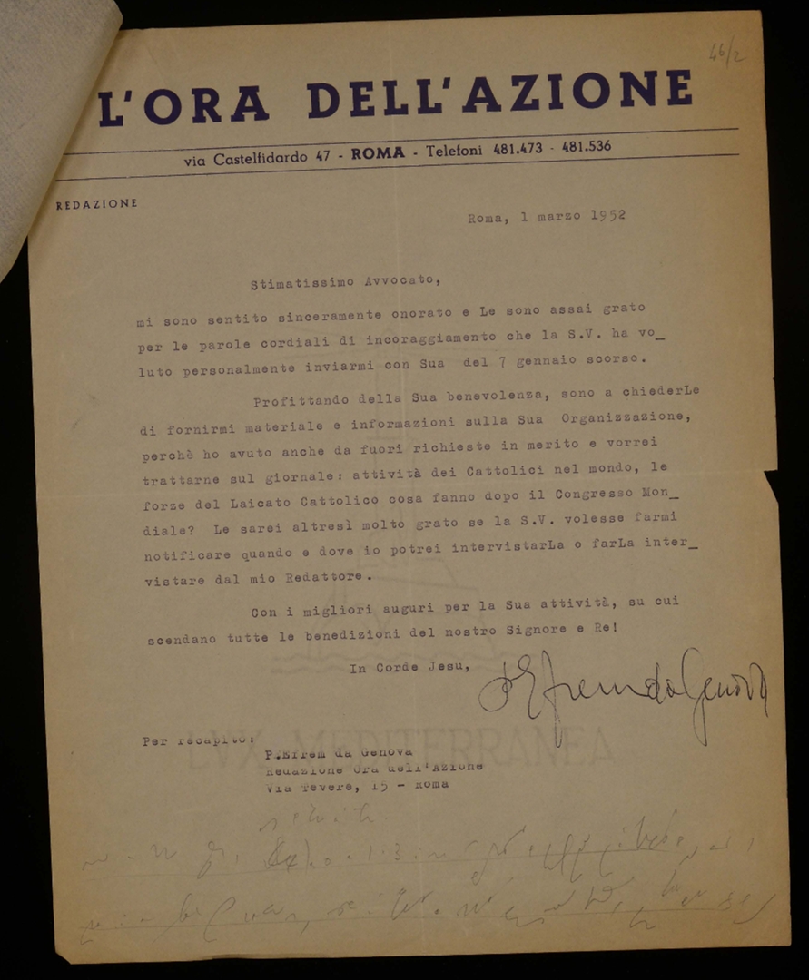 Lettera di Efrem da Genova del periodico "Ora dell'azione" a Vittorino Veronese, presidente del Comitato permanente per i congressi internazionali dell'apostolato dei laici