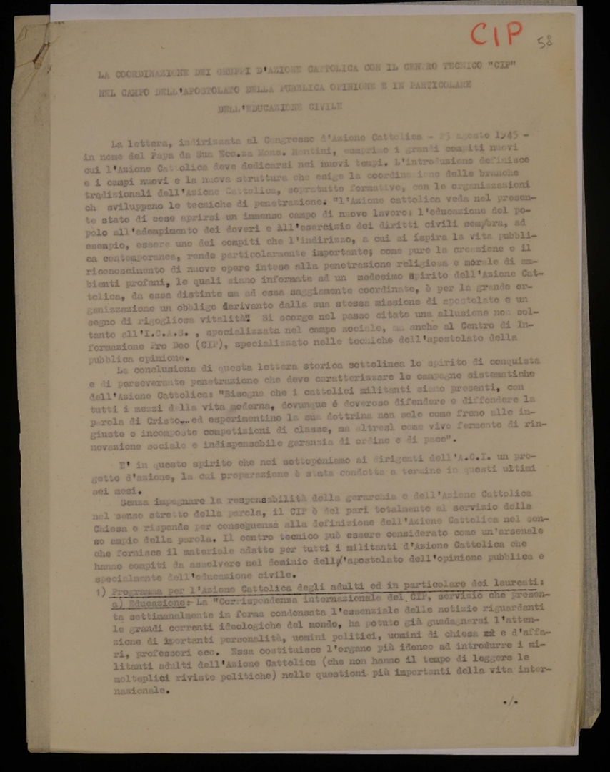 Relazione sui nuovi compiti dell'Azione cattolica nel campo dell'educazione civile e della formazione e sulle metodologie d'azione per l'apostolato dell'opinione pubblica proposte dal Centro Informazioni Pro Deo - CIP. Dattiloscritto
