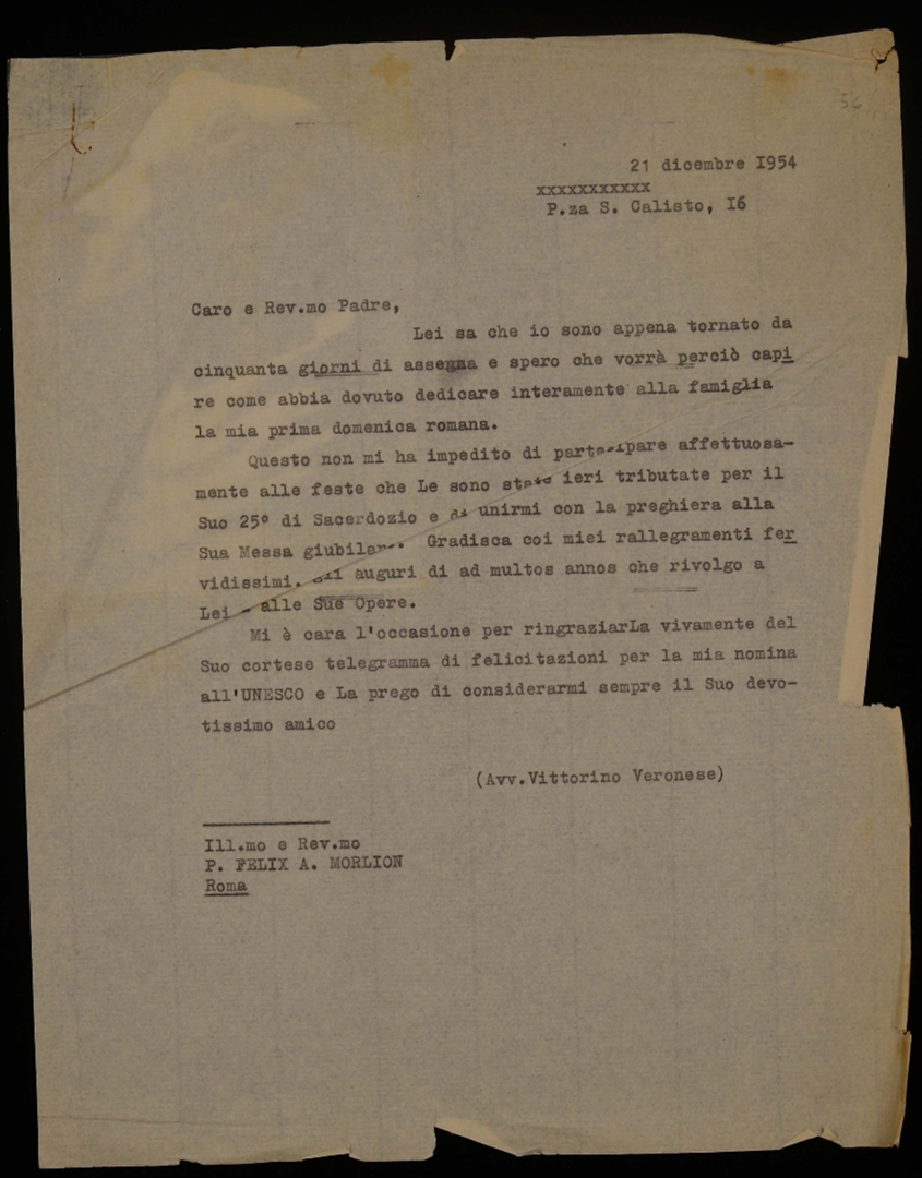 Vittorino Veronese rinnova gli auguri a padre Félix Morlion per il suo 25° anno di sacerdozio e lo ringrazia per le felicitazioni ricevute per la sua nomina all'Unesco. Dattiloscritto
