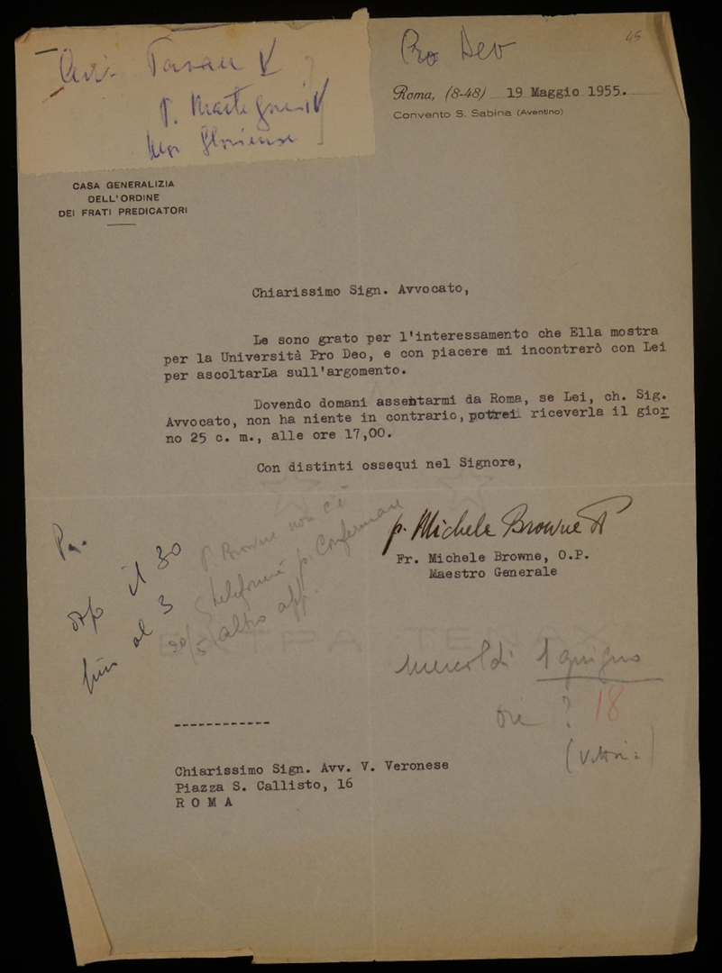 Lettera di padre Michele Browne, maestro generale dell'Ordine dei domenicani, a Vittorino Veronese