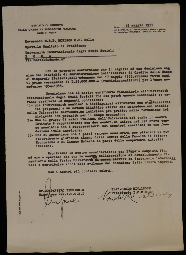 Lettera a firma di Costantino Tessarolo e Paolo Ricaldone, rispettivamente direttore generale e presidente dell'Istituto di credito delle casse di risparmio italiane - ICCRI, indirizzata a padre Félix Morlion, rettore dell'Università internazionale di studi sociali