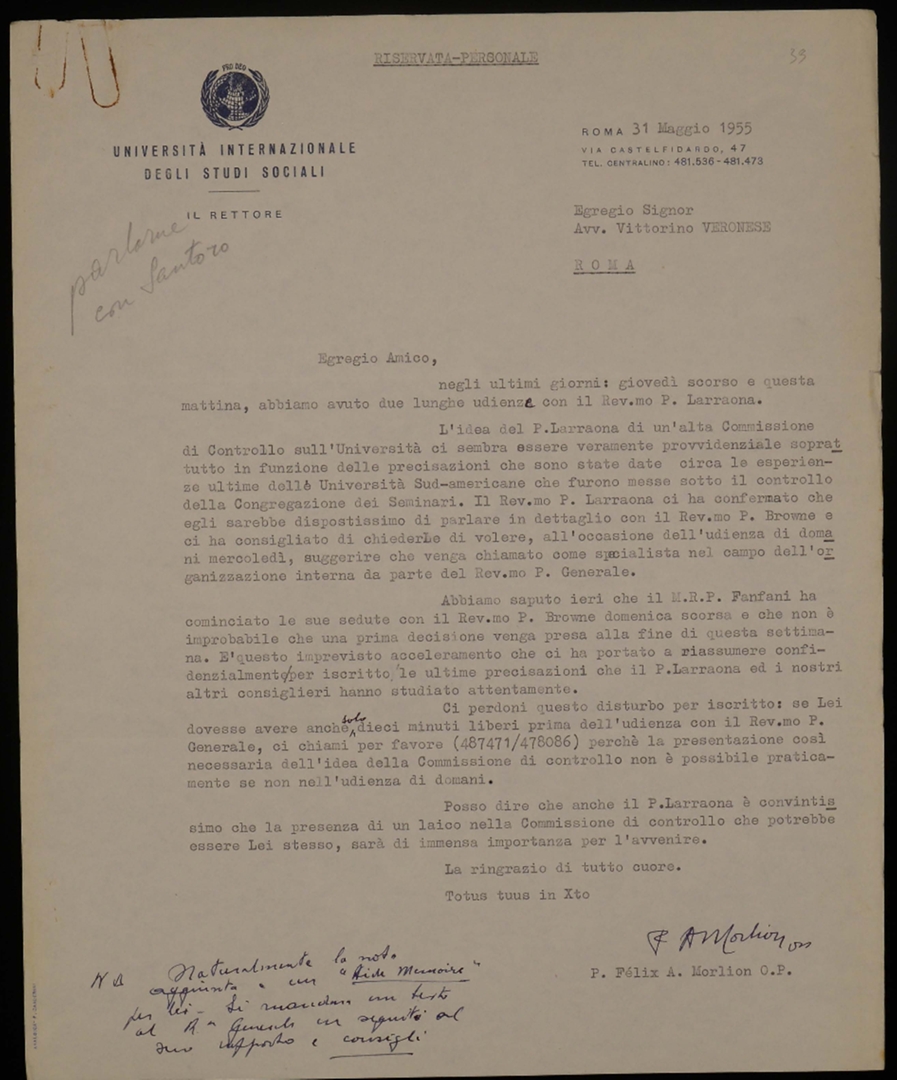 Con lettera di trasmissione di padre Félix Morlion, rettore dell'Università internazionale di studi sociali, a Vittorino Veronese, presidente del Comitato permanente per i congressi internazionali dell'apostolato dei laici. Dattiloscritto