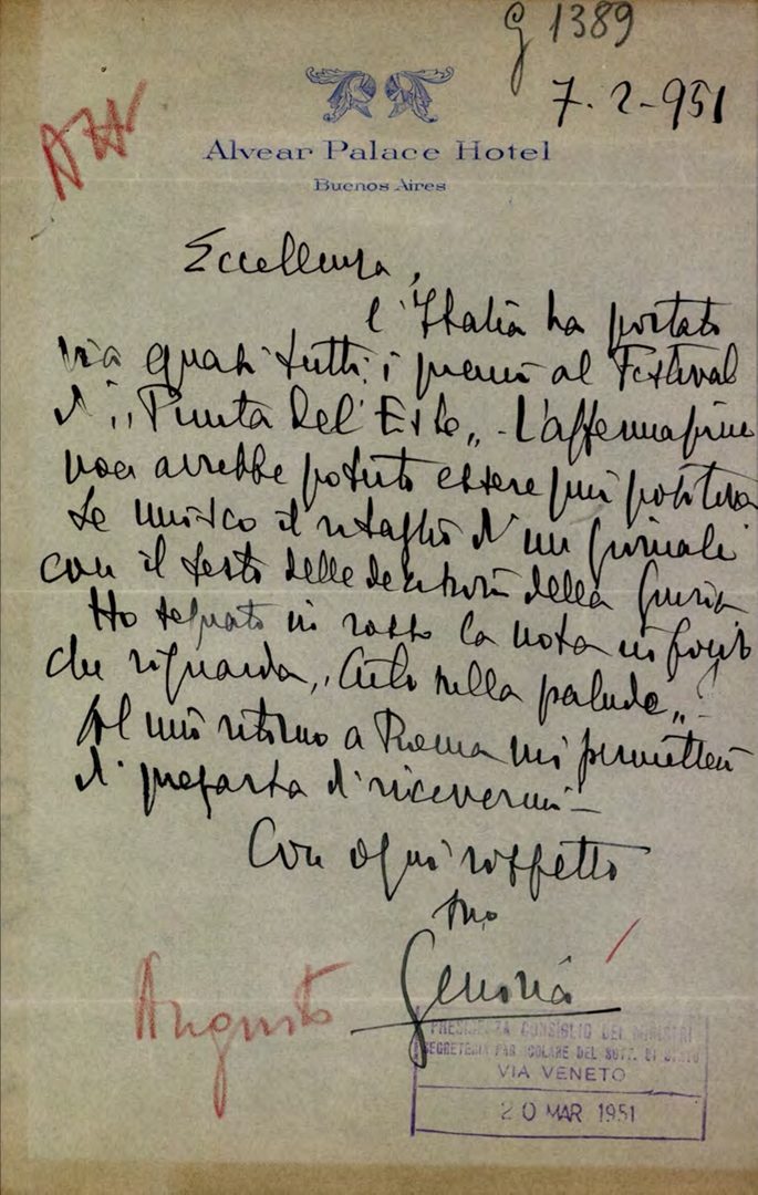Augusto Genina informa Giulio Andreotti sui premi ricevuti dall'Italia al Festival Punta del Este, con particolare riferimento al film "Cielo sulla palude" da lui stesso diretto. Manoscritto