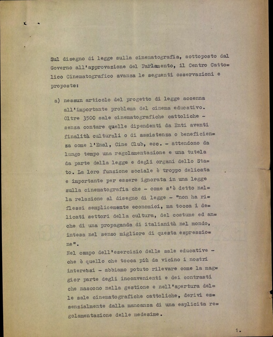 Osservazioni sui contenuti del nuovo progetto di legge: cinema educativo, obbligatorietĂ della programmazione di film nazionali, restrizione all'attivitĂ dei cinema ambulanti. Dattiloscritto