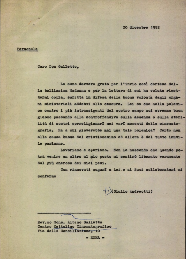 Lettera dell'on. Giulio Andreotti, sottosegretario di Stato alla presidenza del consiglio dei ministri, a mons. Albino Galletto, consulente ecclesiastico del Centro cattolico cinematografico - CCC