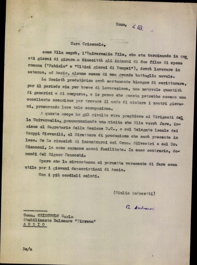 Giulio Andreotti segnala a Carlo Criscuolo la necessità di reclutare sul posto attori non professionisti per alcune scene di film prodotti dalla Universalia ambientate ad Anzio. Dattiloscritto