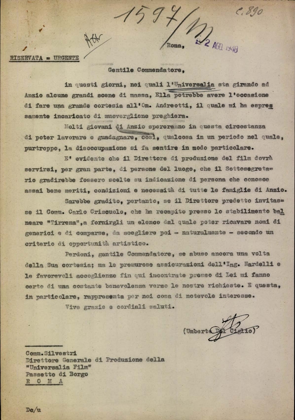Umberto Del Ciglio scrive a Silvestri a proposito della possibilità di reclutare attori non professionisti per alcune scene di film prodotti dalla Universalia ambientate ad Anzio. Dattiloscritto