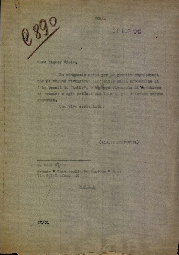 Lettera dell''on. Giulio Andreotti, sottosegretario alla presidenza del consiglio, al regista francese René Clair