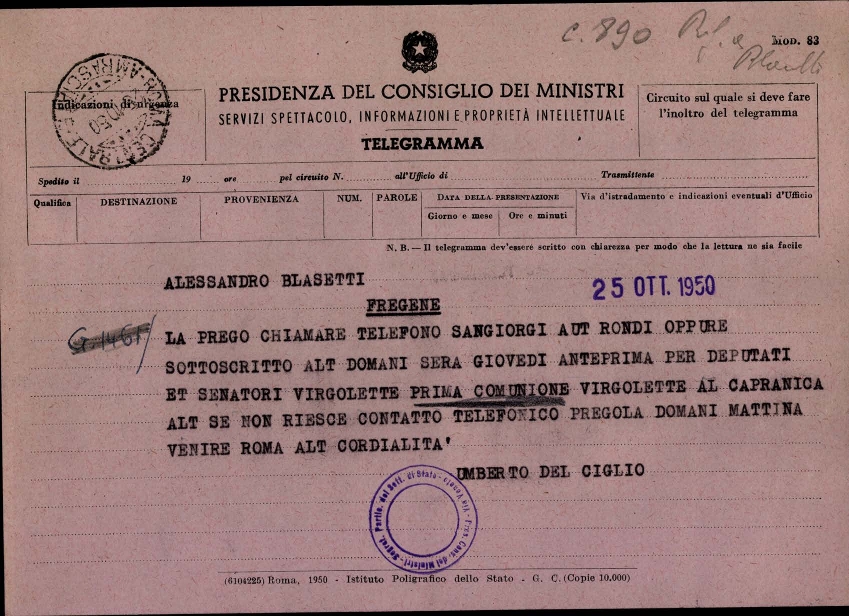 Telegramma di Umberto Del Ciglio al regista Alessandro Blasetti