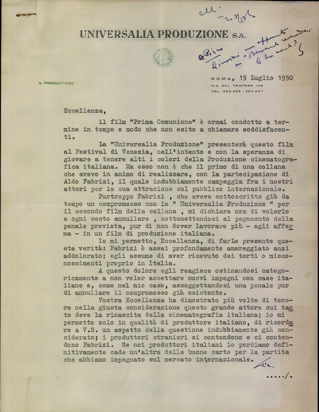 Salvo D'Angelo si rammarica con Giulio Andreotti per il rifiuto dell'attore Aldo Fabrizi di partecipare ad un secondo film prodotto dalla Universalia e contestualmente comunica la presentazione del film "Prima Comunione" di Alessandro Blasetti al prossimo festival del cinema di Venezia. Dattiloscritto