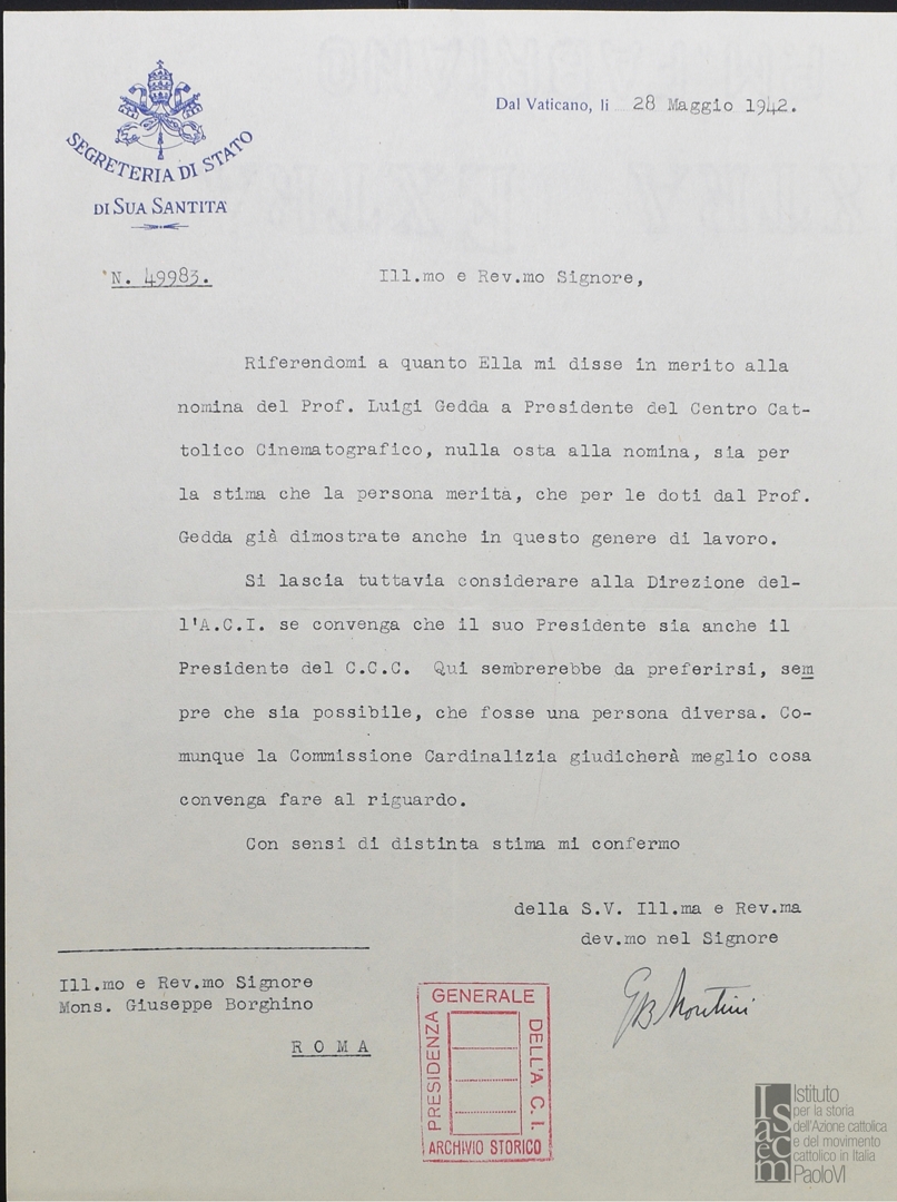 Montini scrive a Borghino in merito al progetto di statuto del Centro cattolico cinematografico e al suo regolamento, facendo riferimento alla doppia carica di Luigi Gedda, come presidente dell'ACI e dello stesso Centro cattolico cinematografico
