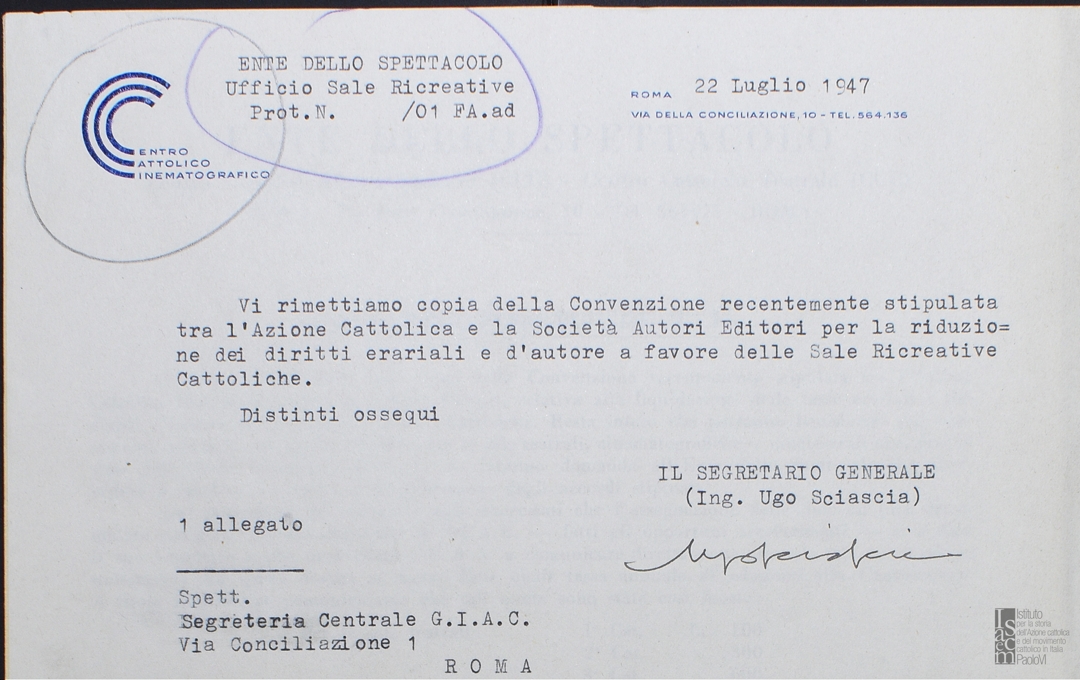 Ugo Sciascia, segretario generale dell'Ente dello spettacolo, invia alla segreteria centrale della GIAC copia della convenzione per la riduzione dei diritti erariali per le sale ricreative cattoliche