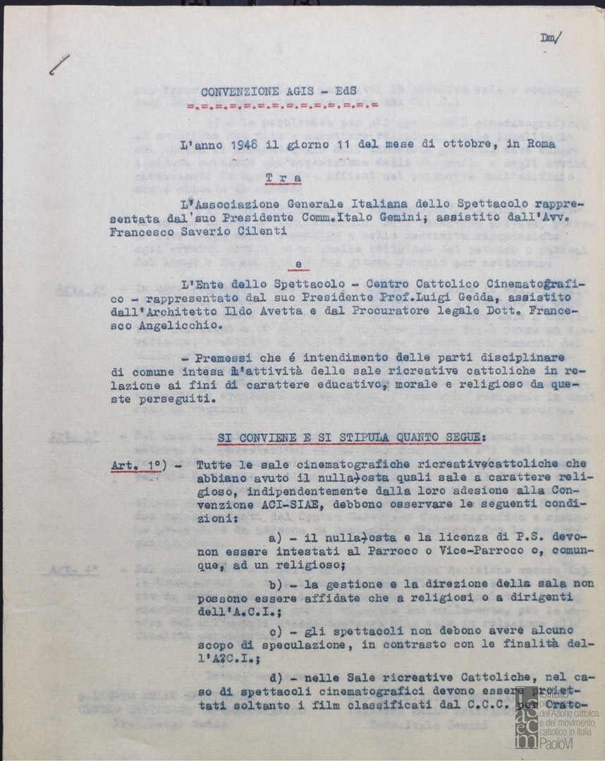Testo della convenzione a firma di Italo Gemini per l'AGIS, e Luigi Gedda per l'Ente dello spettacolo
