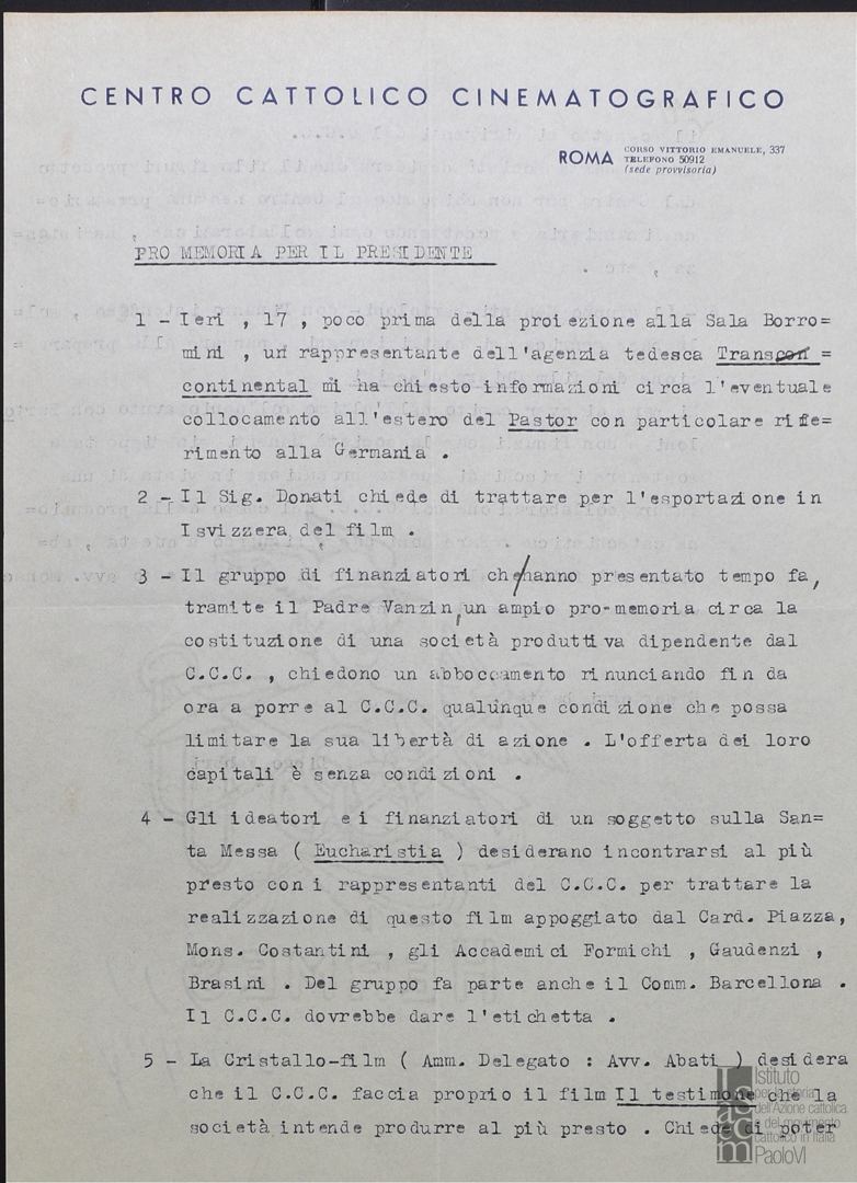 "Centro cattolico cinematografico. Promemoria per il presidente"