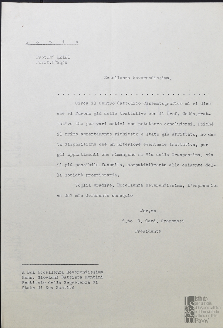Cremonesi informa Montini sulla ricerca di una sede per il Centro cattolico cinematografico. Minuta
