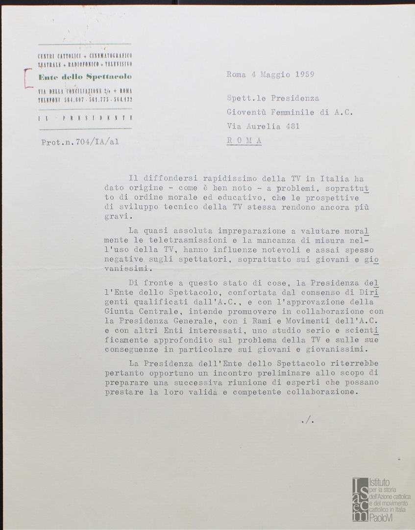 Il presidente dell'Ente dello spettacolo, Ildo Avetta, invita la presidenza di GF all'incontro previsto per il 13 maggio1959