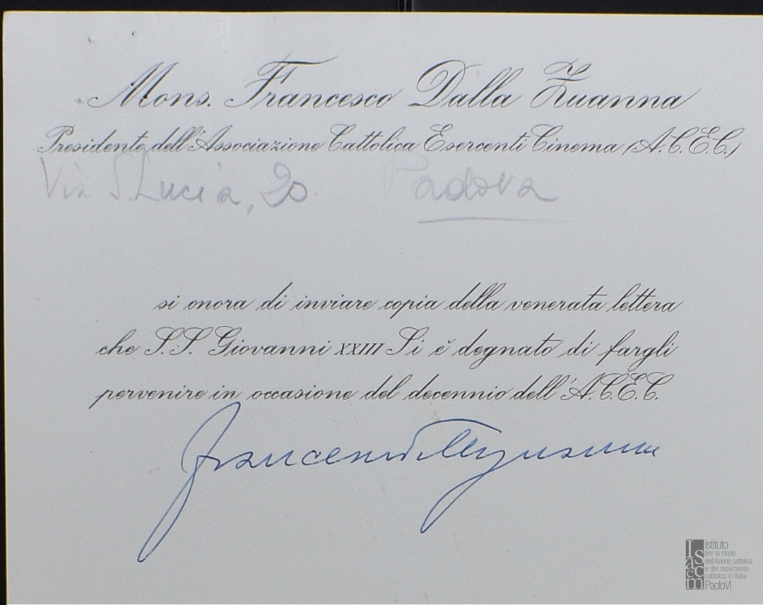 Lettera di Giovanni XXIII a Francesco Dalla Zuanna per il decennio dell'ACEC