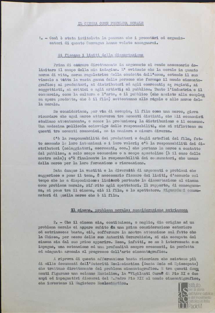 Lezione di Salvatore Canals ad un convegno del cinema cattolico (ottobre 1956)