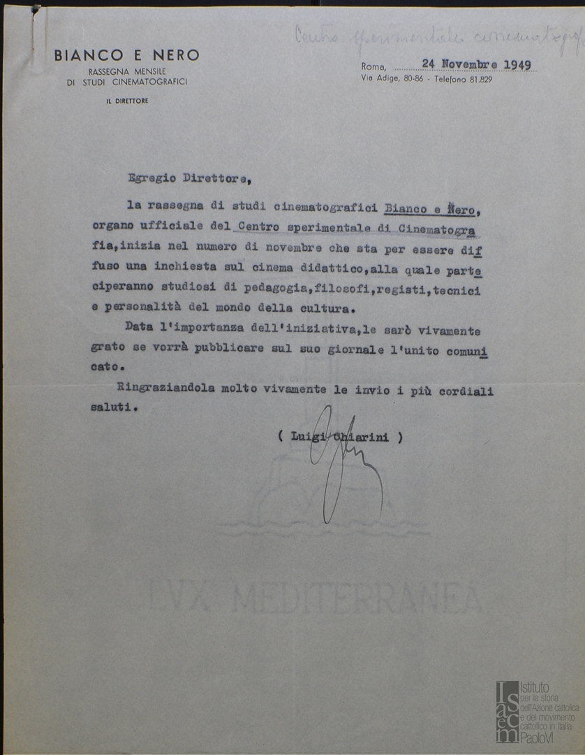 Comunicazione di Luigi Chiarini sull'iniziativa della rivista del Centro sperimentale di cinematografia e allega "un articolo del ministro Gonella sul tema del cinema didattico"