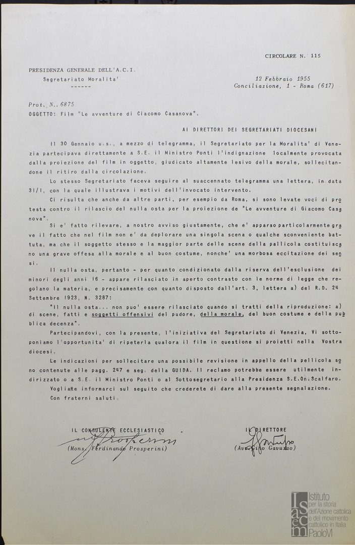Circolari della Presidenza generale dell'ACI Segretariato moralità indirizzate ai direttori dei Segretariati diocesani, con l'elenco dei film vietati ai minori di anni 16 dalla Commissione governativa di revisione cinematografica (Ministero dell'Interno)
