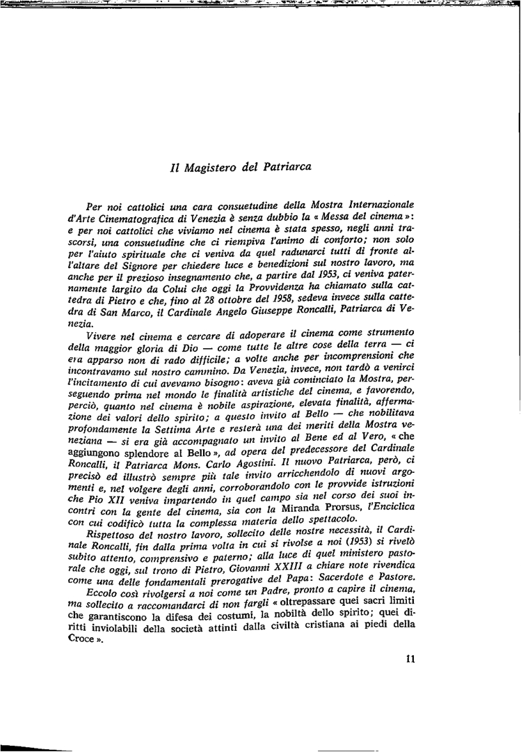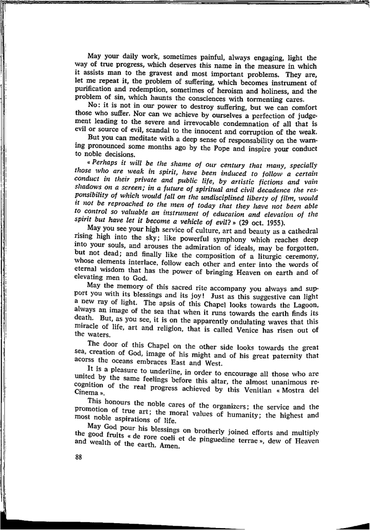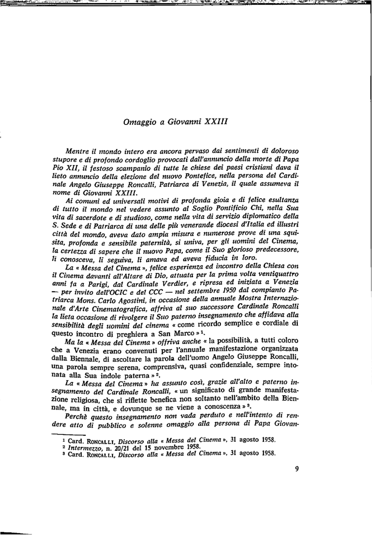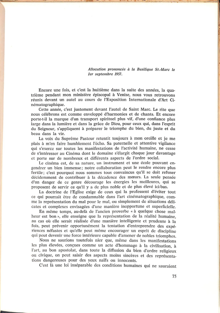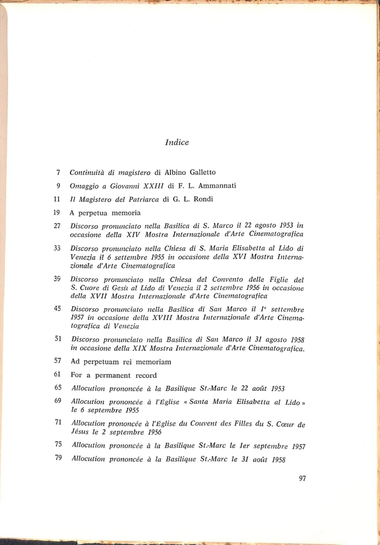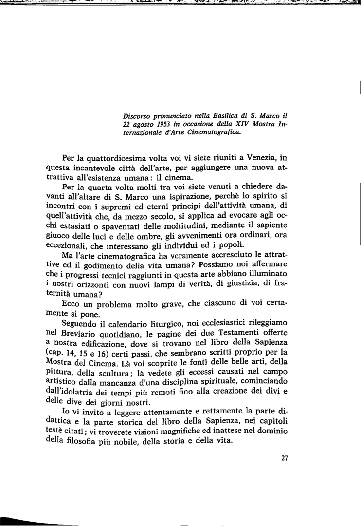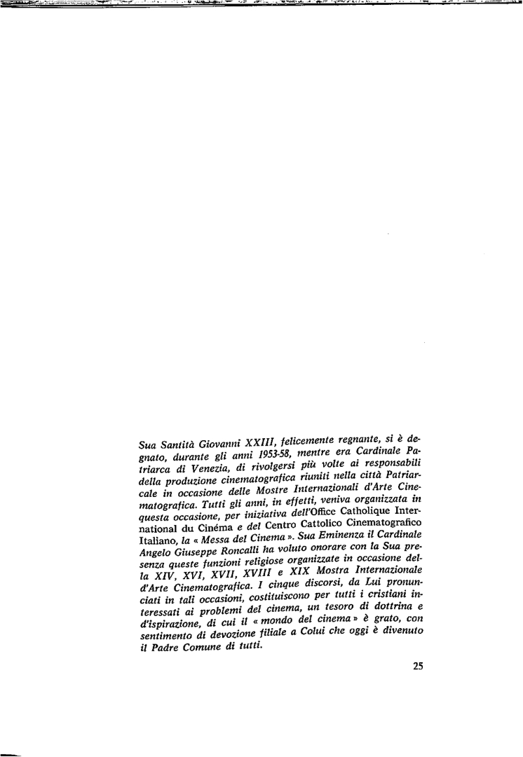 Il documento รจ un solenne omaggio a Giovanni XXIII e al suo rapporto con il cinema negli anni da cardinale e da patriarca di Venezia redatto dagli esponenti della Mostra Internazionale d'Arte Cinematografica di Venezia, dell'Associazione Nazionale Industrie Cinematografiche e Affini (ANICA) e dell'Associazione Generala Italiana dello Spettacolo (AGIS), i quali hanno collezionato nel volume i discorsi sul cinema tenuti da Roncalli nel periodo compreso tra il 1953 e il 1958.