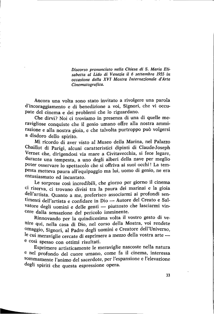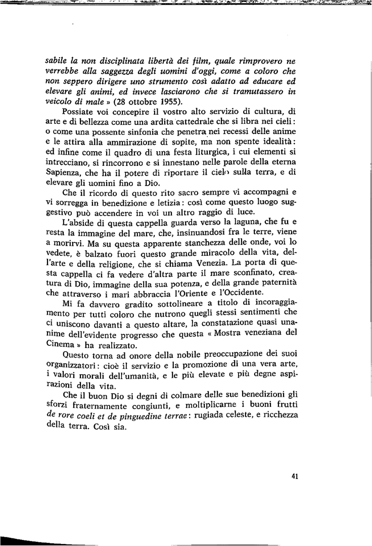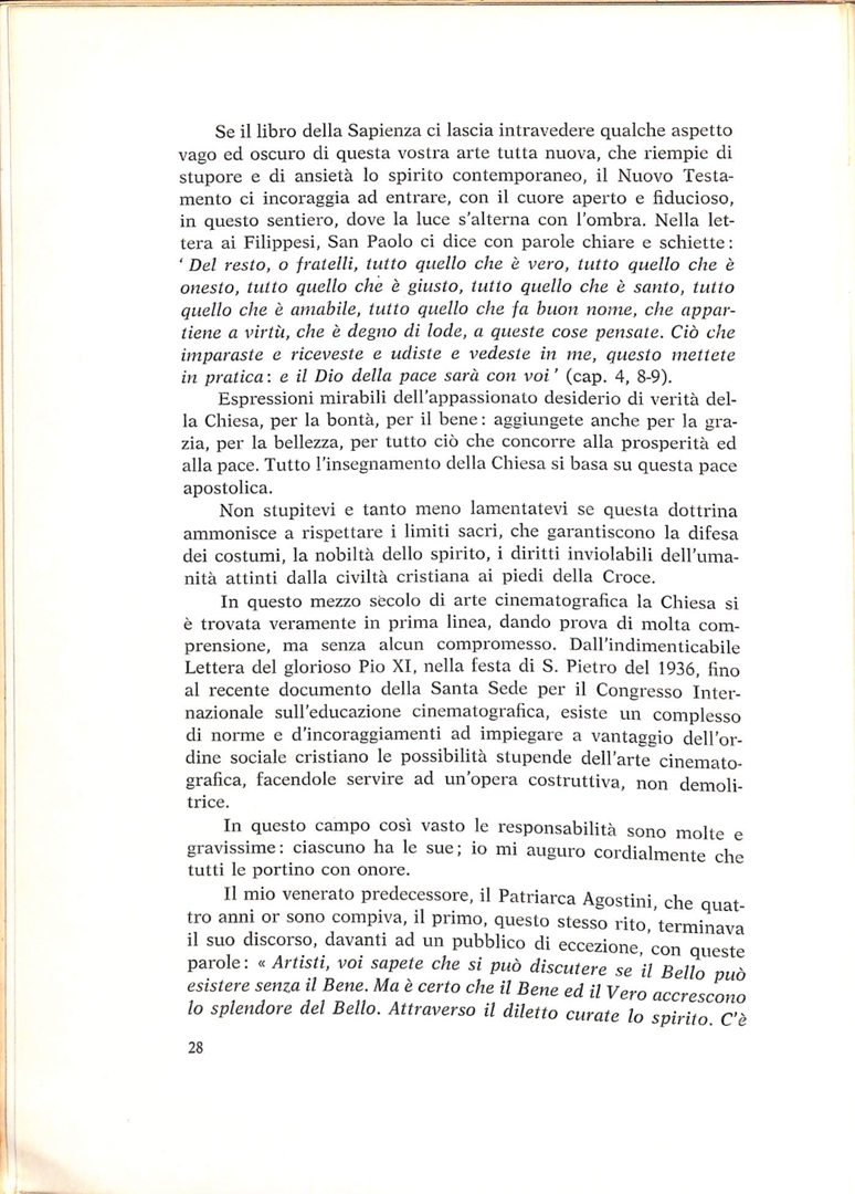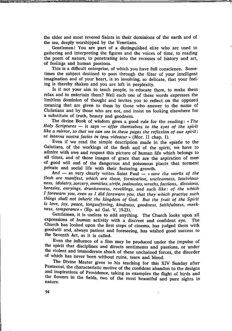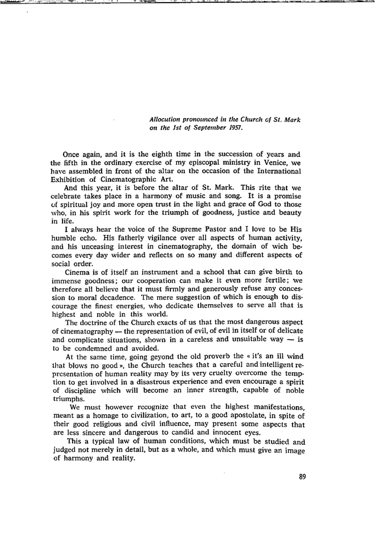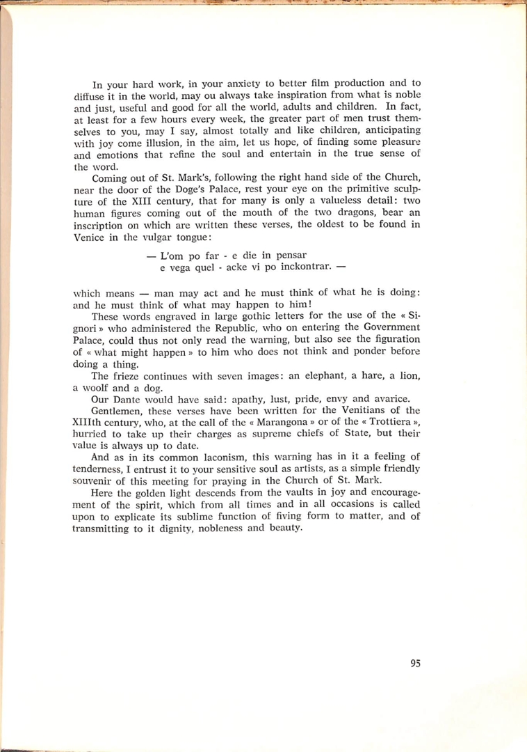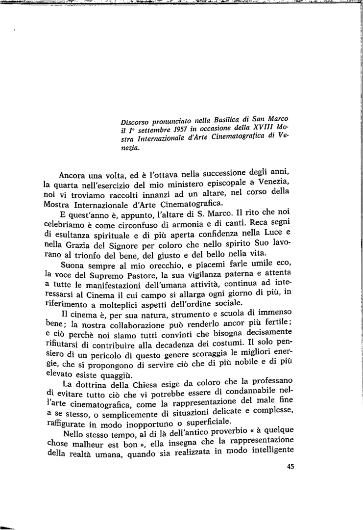 Il documento รจ un solenne omaggio a Giovanni XXIII e al suo rapporto con il cinema negli anni da cardinale e da patriarca di Venezia redatto dagli esponenti della Mostra Internazionale d'Arte Cinematografica di Venezia, dell'Associazione Nazionale Industrie Cinematografiche e Affini (ANICA) e dell'Associazione Generala Italiana dello Spettacolo (AGIS), i quali hanno collezionato nel volume i discorsi sul cinema tenuti da Roncalli nel periodo compreso tra il 1953 e il 1958.